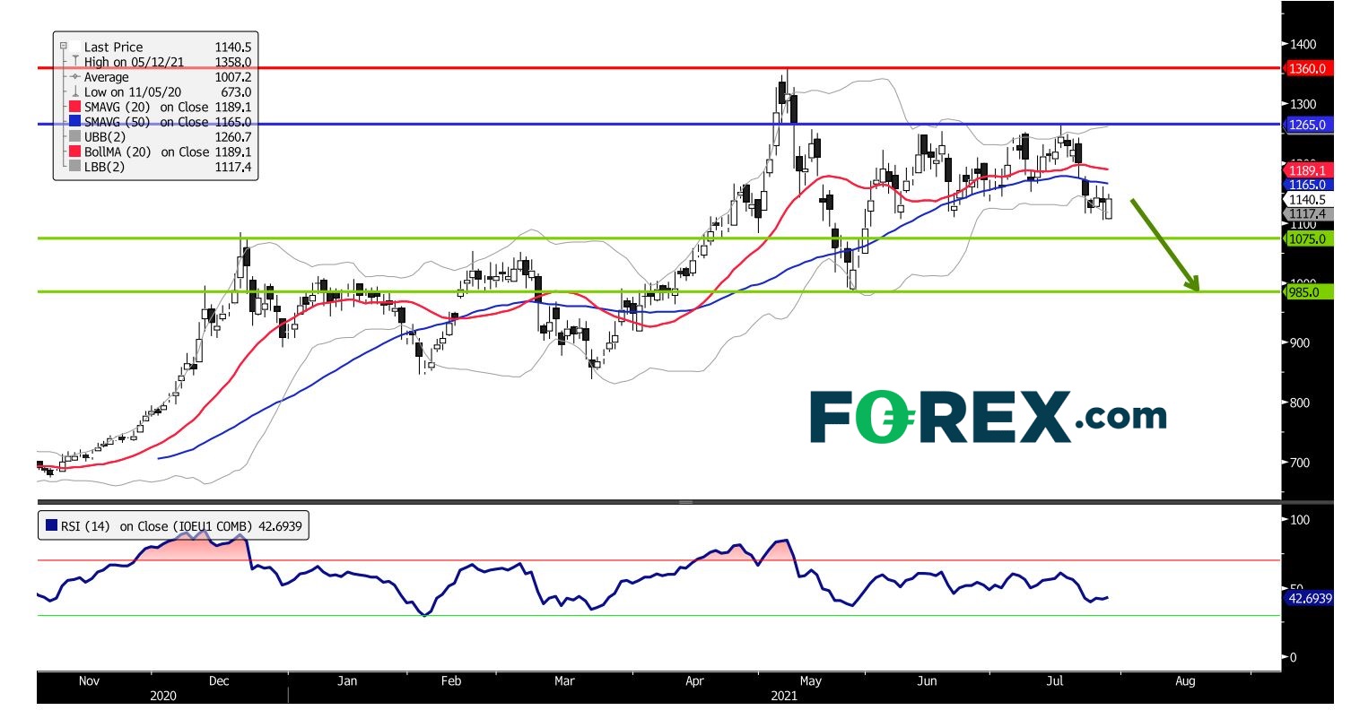 在看跌主要阻力 (止损) 位1,265元人民币之下操作,铁矿石期货价格预期将跌向下行目标1,075元人民币和985元人民币 (5月低位)。