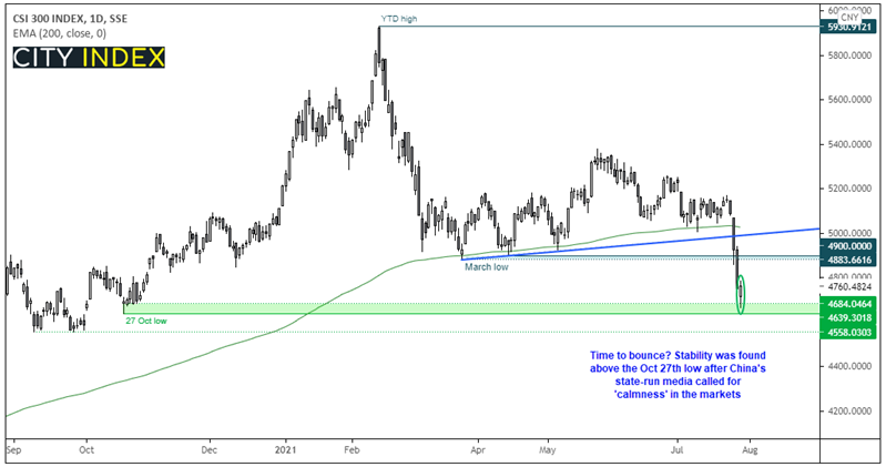 中国国有媒体昨天呼吁市场“冷静”,中国股市的暴跌势头似乎因此已有所放慢。香港恒指上周五以来跌近10%,目前稳定在25000附近。中国政府在上周五宣布针对教育科技领域的新监管措施。但如果要我们选择一个可能上修的指数,那很可能是中国CSI300指数,因为可以判断在媒体呼吁的同时另一道防线,即干预性买盘可能已经筑起(或即将筑起)。