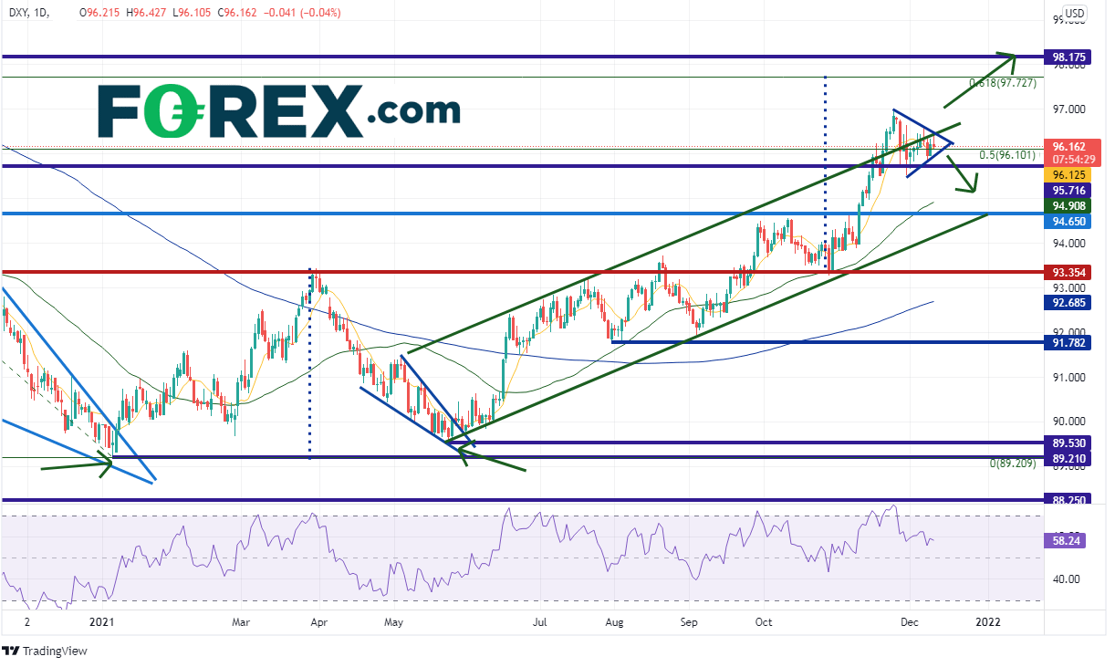 与此同时,美元指数也在逼近对称三角形的相汇点与2020年3月高点到2021年1月低点行情的50%回档位,可能向上打破三角形。如果站上96.50,第一阻力在11月24日高点96.94,然后是前述行情的61.8%回档位所在的97.72(也是双底形态的目标),接着是水平阻力位98.17。