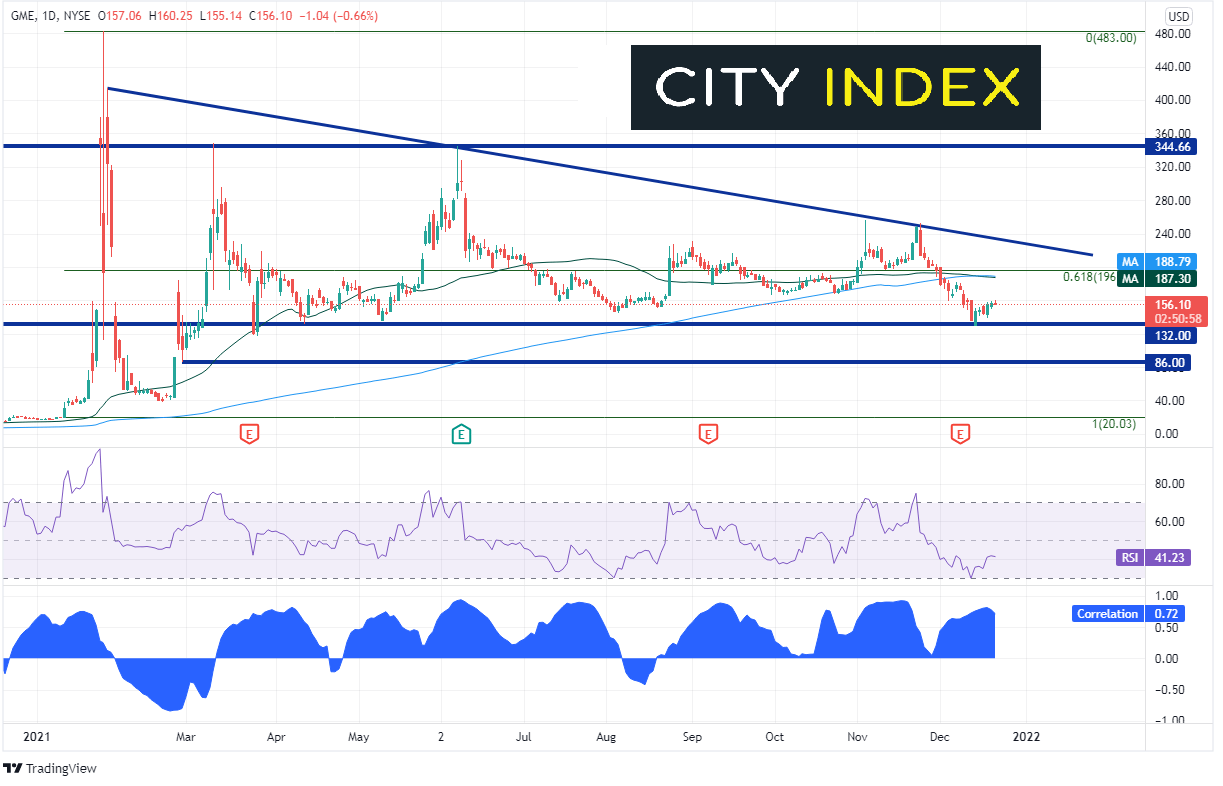 GME是最早的一支Meme股票。该股一年前还交投于15美元附近。但随着网民们齐聚一堂并合力推高价格,该股最终在2021年1月29日站上483.00高点。自该高点回落以来,GME一直于50天均线附近震荡并构筑一系列高点降低。132.00似乎充当了强劲支撑。GME已跌破1月13日低点至1月29日高点下行之161.8%斐波那契回档位96.88的。50和200天均线分别在187.30和188.79处提供交汇阻力。