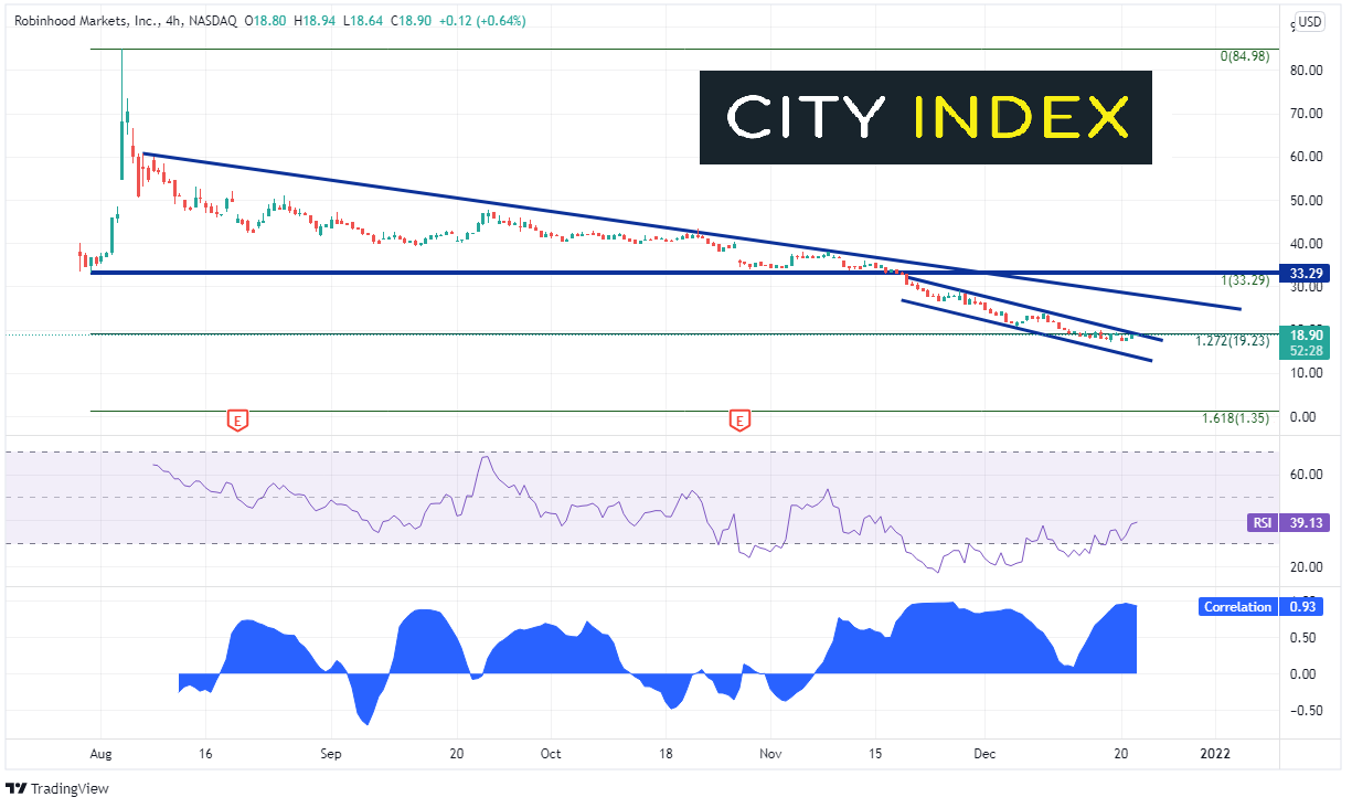 7月29日,Robinhood Markets在纳斯达克(NASDAQ)上市时并未引起太大关注,当天小幅收低。但8月3日和4日,随着互联网做出反应,HOOD价格开始回升。股价在2天内自38.00狂飙至84.98高点。但和其他Meme股一样,该股同样遭遇回落。观察日线图的意义不大,而且也没有多少数据可供分析。240分钟图上,该股与罗素2000指数的相关系数非常高,达+0.93。完全正相关为+1.00。(GME和AMC在240分钟图上的相关系数低于日线图相关系数)。因此,我们可以通过罗素2000走向来帮助确定HOOD股价方向。该股在8月4日创出新高后回落,走出高点降低。11月18日,HOOD跌破发行价,目前正继续下挫。HOOD价格走势于7月30日低点到8月4日高点上行之127.2%扩展位19.23附近停滞。支撑在底部通道下方趋势线13.80附近。若股价继续走低,下个支撑一直要看到同时期走势之161.8%扩展位(是的,1美元35美分!)阻力位在顶部通道下斜趋势线19.25附近,8月初以来下斜趋势线在28.25附近。IPO当天低点33.29将为下一阻力。