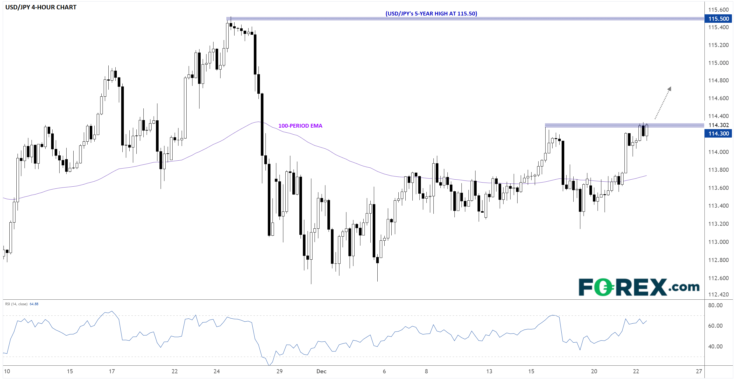 上述报告推动美元全面走高,而美元/日元因为四季度迄今一直处于上涨趋势尤其引人瞩目。下面的4小时图显示,此文发稿时美元/日元正在上攻4周高点114.30。如果确认站上该短线阻力位,可望打开继续上攻的空间,年内上看5年高点,即115.50附近。