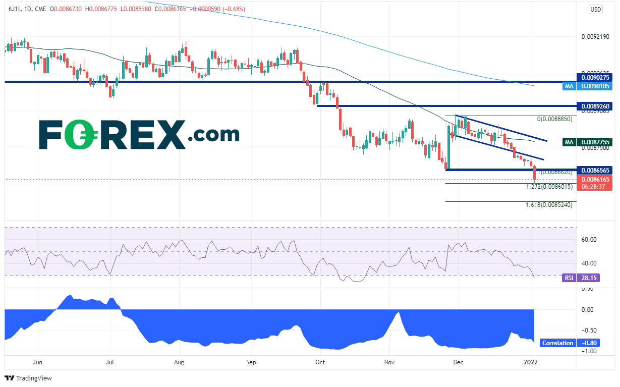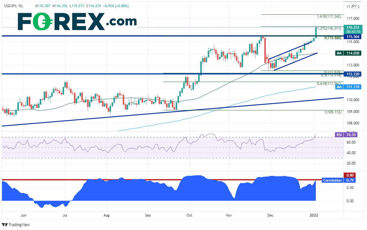 相关系数是衡量、比较两种交易产品间关联性强度的指标。美元/日元和美国10年期国债收益率之间的相关系数目前报在+0.79,非常接近于交易者应当关注的“重要”水平,即高于+0.80或低于-0.80,应该引起我们的重视。如果收益率继续上涨,美元/日元可能随之走高。美元/日元目前交投于2021年11月24日高点到2021年11月30日低点行情的127.2%扩展位附近,即116.30一线,为2017年1月以来最高点。上档阻力在同期行情的161.8%扩展位117.34附近,然后是2017年1月高点118.66。下档支撑位在前高点115.52、今天低点115.27。如果下破后者,美元/日元可能跌至50天均线所在的114.02附近。请注意,RSI处于超买区域,表明价格可能准备回调。