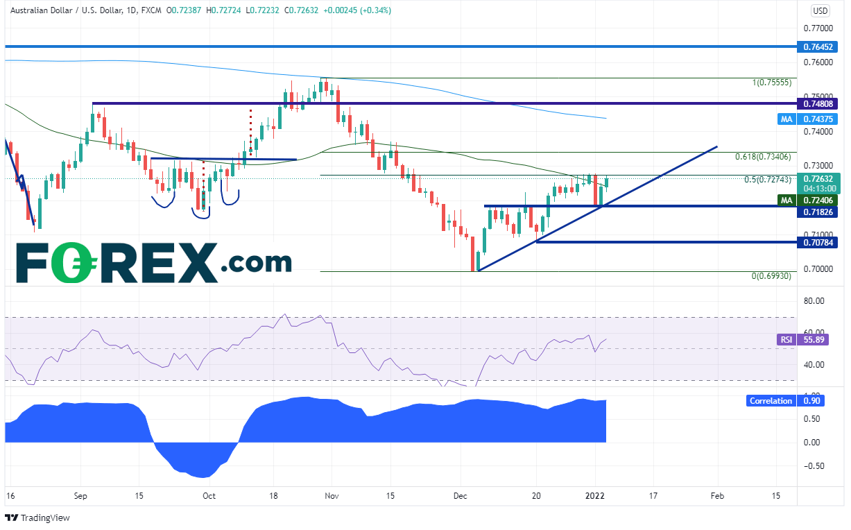 受到OPEC+做出符合预期的产出配额决策、原油库存减少、道指上涨的推动,西得州原油价格在2022年前3个交易日走高。但回调时机或已成熟,如果确实回撤,与之高度相关的澳元/美元可能随之回调。