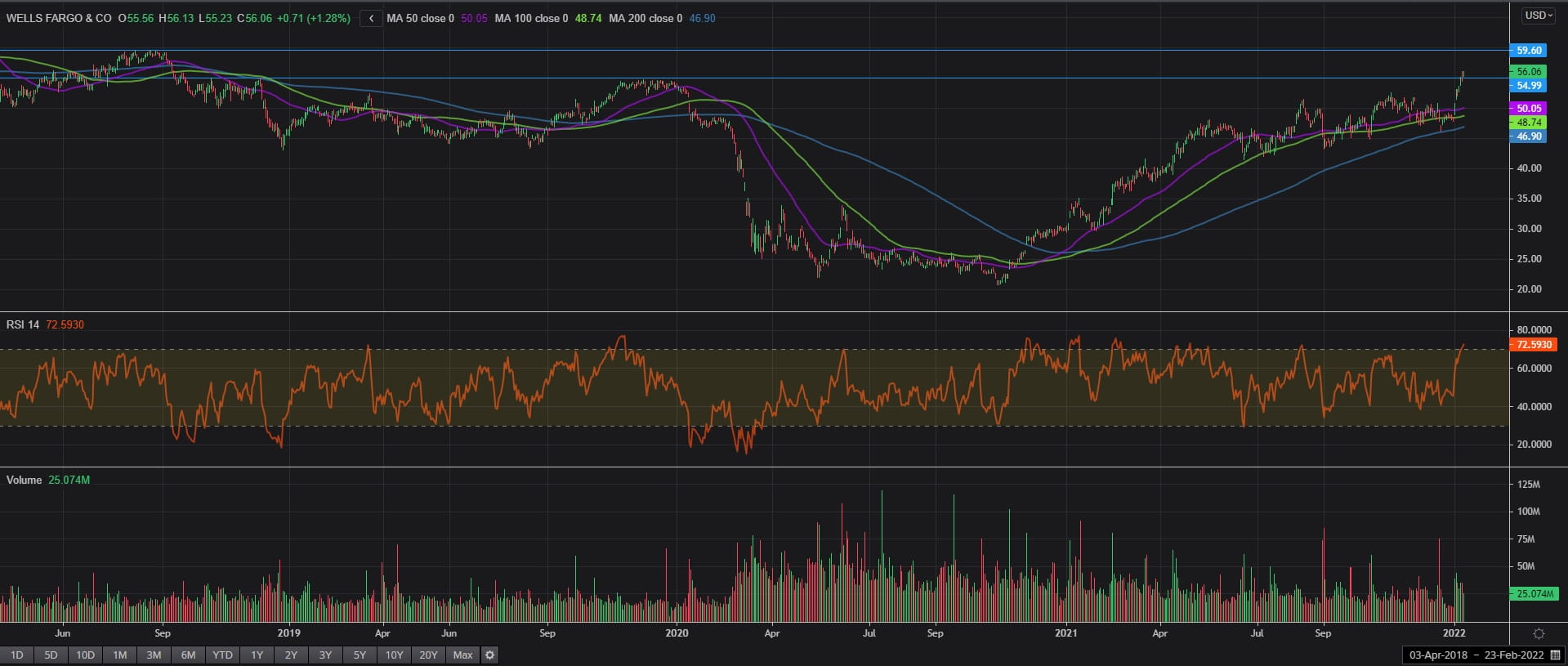 不过,富国银行2022年的开局不错,年初至今反弹了10.5%,原因是投资者预期其盈利稳健,认为管理层终于能够带领公司摆脱困境,以及美联储可能很快取消对其净资产规模上限的限令。另外,如果美联储今年加息,传统借贷业务占比极重的富国银行有望成为最大的受益者之一。所以,市场看好富国银行2022年的前景。