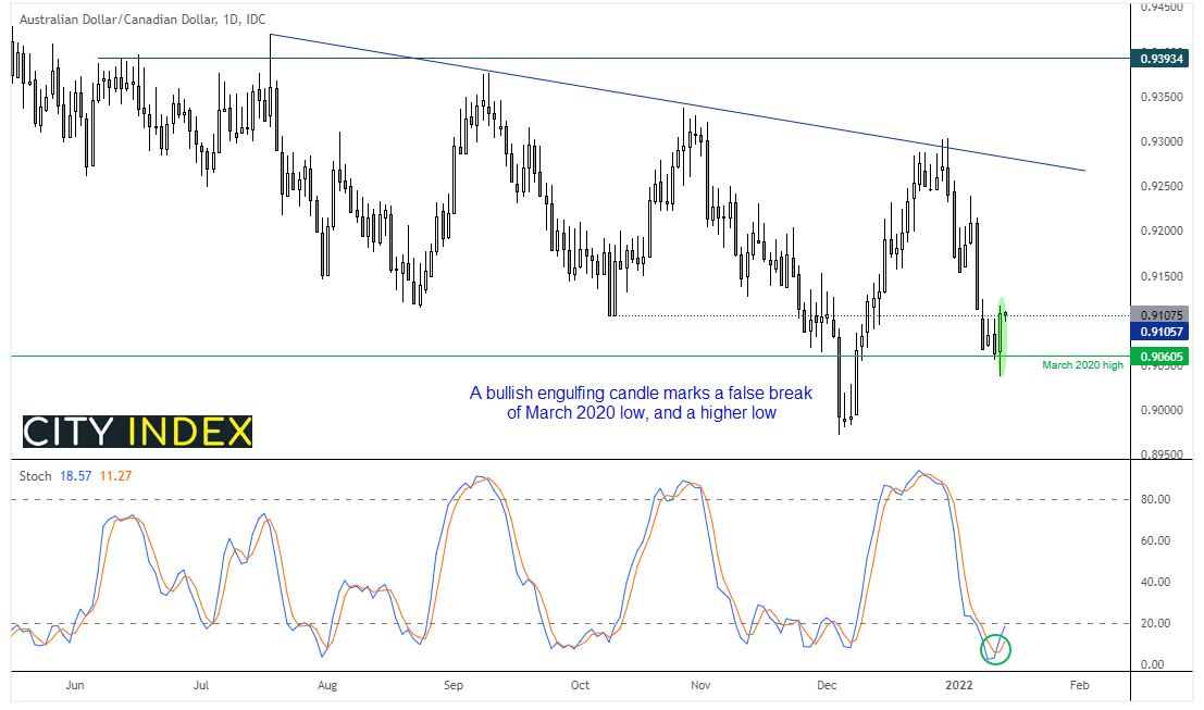 虽然英镑/美元延续令人印象深刻的涨势,但兑澳元和纽元并非如此。英镑/澳元和英镑/纽元均迎来强劲反弹,但已双双进入超买区域,目前动能转而推低。两者交投重回前周期高点下方,修正展开,从而为交易员提供了反趋势交易或观望等待支撑构筑并重回日线图主导看涨趋势的选择。