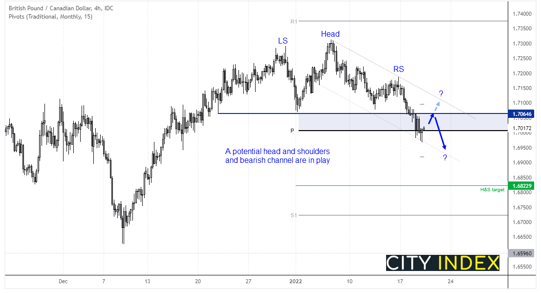 加拿大将在午后13:30发布通胀报告。鉴于英国通胀会在稍早发布,而英镑/加元正落在关键阻力下方,值得关注。日线图已形成头肩顶部形态,预测目标位在1.6823附近,只要价格保持1.7065颈线之下,形态继续起效。