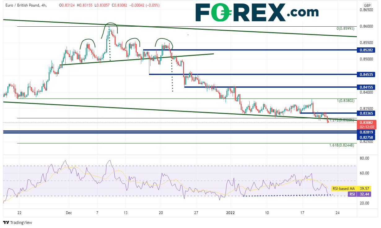 欧元/英镑4小时图不仅下破上述通道的下轨趋势线,还攻克2021年11月19日低点到2021年12月8日高点行情的127.2%扩展位,即0.8321附近。下方第一支撑落在0.8282-0.8276区间,前者为2020年2月低点,后者为2019年12月低点。如果失守,可能下看同期行情的161.8%扩展位,即0.8244附近。但请注意,RSI正与价格形成背离,表明价格可能准备反击。上方阻力先后有水平阻力位0.8336、前支撑位0.8380、又一前支撑位现阻力位0.8416。