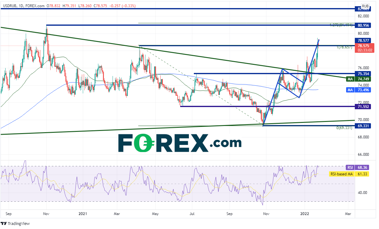那么,卢布会走向哪里?美元/卢布4小时图似乎仍在走高,已经形成了短线旗形形态。该形态突破后的目标在80.25附近,那也是2021年4月5日是高点到10月26日低点行情的127.2%扩展位。第一水平阻力位在2020年11月2日高点,然后是2020年3月以来高点82.86。如果价格确实很快冲高(比如,在俄罗斯入侵乌克兰的帮助下),目标可能在前面提到行情的161.8%扩展位84.42。价格目前交投于第一支撑位,即2021年4月6日以来高点78.58附近。如果失守,下看水平支撑位77.20和75.61,然后是50天均线74.75(请看日图)。