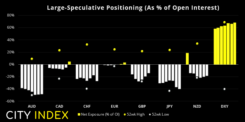 上周,大型投机商自2021年5月以来首次转而净做多墨西哥比索。过去的4周内,多头增持4.54万份多头合约,空头也增持了3.57万份空头合约。这种情况说明投资者很可能是在进行对冲,并非我们想要看到的强劲看涨信号。墨西哥比索也已连续7周走高,所以我们不禁好奇比索会不会结束连涨,多头会不会重新考虑敞口设置。