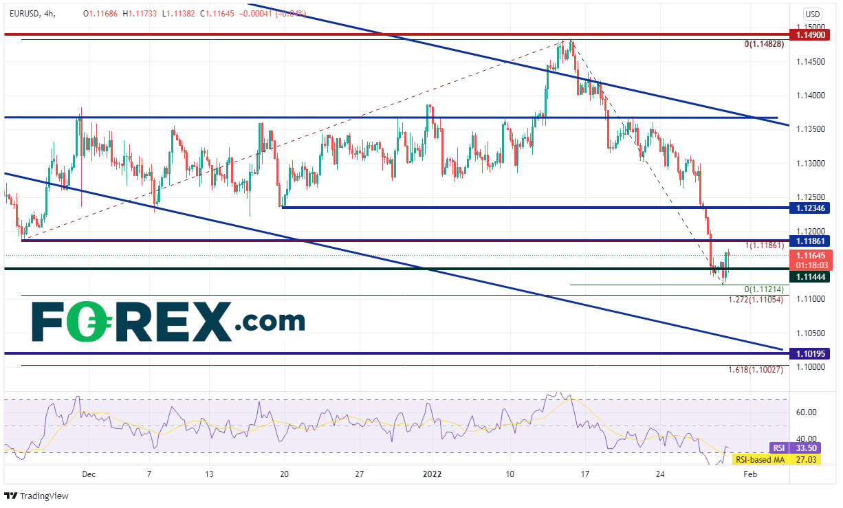 2021年5月以来,欧元/美元一直有序下跌,形成下降通道。继2021年11月24日假性下破通道至1.1186之后,该货币对又回到前述通道内。欧元/美元窄幅交投,直至1月12日假性上破该通道上轨,至1.1490附近。该货币对随后回到通道内且加速下滑,攻克11月以来低点1.1186,近期考验2020年3月以来支撑位1.1144附近。