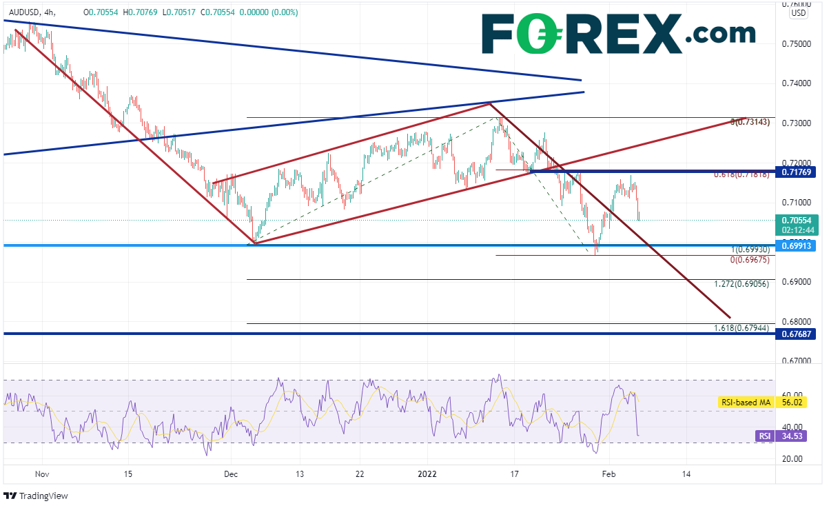 澳元/美元4小时图跌至0.6990支撑位后再度反弹,这次摸至1月13日高点到1月28日低点行情的61.8%回档位,即0.7175附近。该位在50天均线附近,而水平阻力位也落在0.7182附近。在非农就业报告的作用下,该货币对重拾跌势,下探旗形目标。