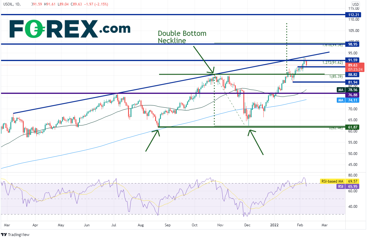 俄罗斯构成OPEC+中的“+”,是整个原油生产链条中的关键生产者。美国与北约盟友不断威胁,如果俄罗斯入侵乌克兰,将制裁俄罗斯。制裁措施从将俄罗斯踢出SWIFT系统到终止Nord Stream 2 Pipeline(俄罗斯-德国天然气输送管道)的协议。入侵的威胁持续存在就足以推高油价。但法国总统Macron本周早些时候与俄罗斯总统普京会晤后表示,俄罗斯军队将在白俄罗斯演习后返回军事基地;得到了普京的保证,不会再向乌克兰边境增兵(虽然后来被普京否认)。该消息帮助西得州油价回到90大关下方。