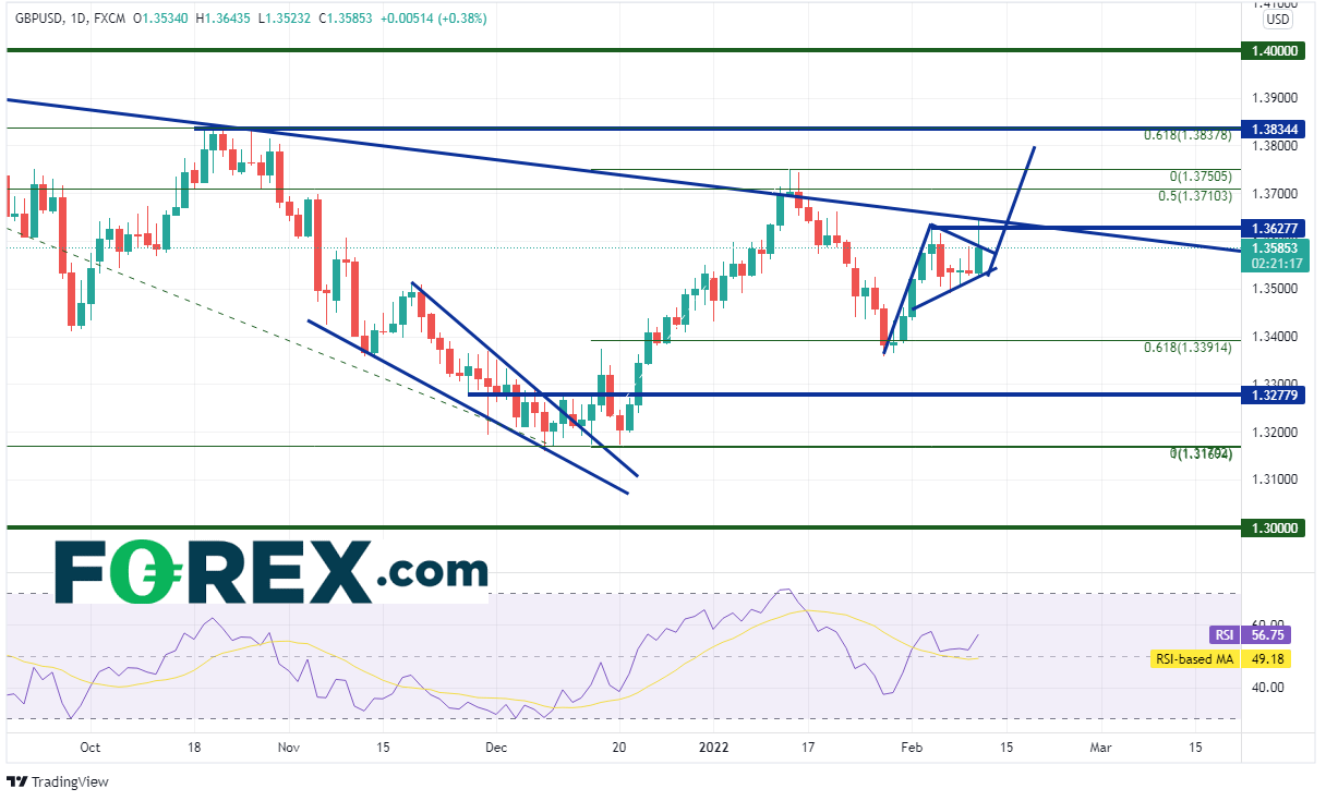 今天高点1.3644现成为第一个阻力位(也落在下斜趋势线),第二阻力位在1月13日以来高点1.3749,接着是三角旗目标上方不远处与水平阻力位和2021年6月1日高点到12月8日低点行情的61.8%回档位共同组成的阻力带,即1.3837附近。支撑位在今天低点与三角旗下轨趋势线1.3523、1月28日低点1.3365、水平支撑位1.3278。
