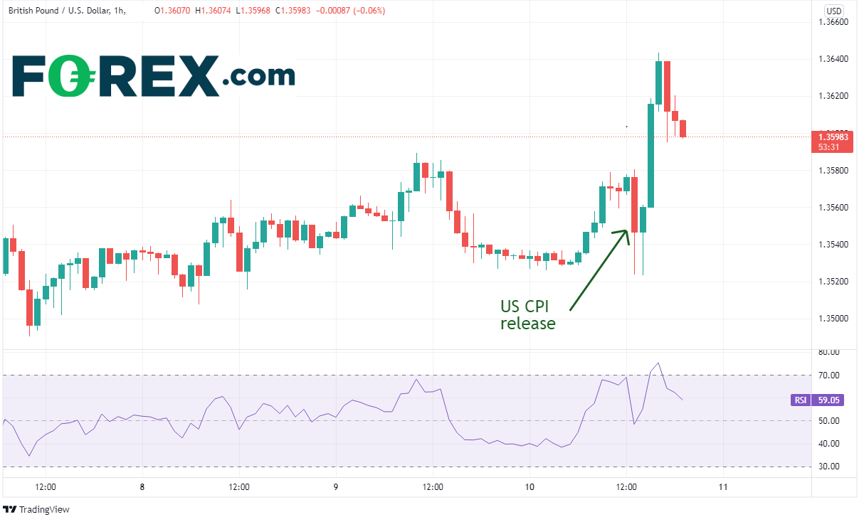 英镑/美元同样如此。该货币对先是在美国CPI数据发布时自1.3580高点下跌至1.3524,但1小时后上涨,至日图新高1.3644,比低点高出120点子。
