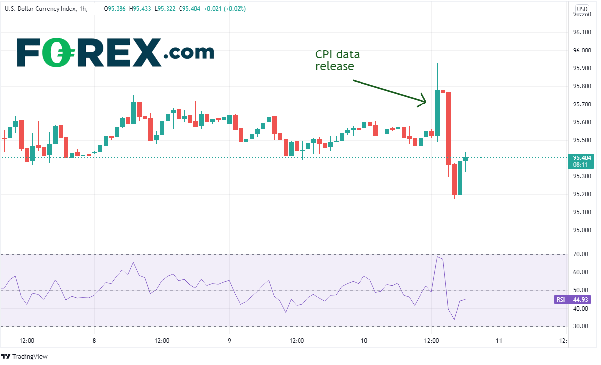 美元指数小时图自95.52上涨至96.00高点并形成射日之星形态,表明价格可能调头向下。事实上随着交易者意识到CPI数据的增量没有提供新的信息,美元指数也确实转跌。