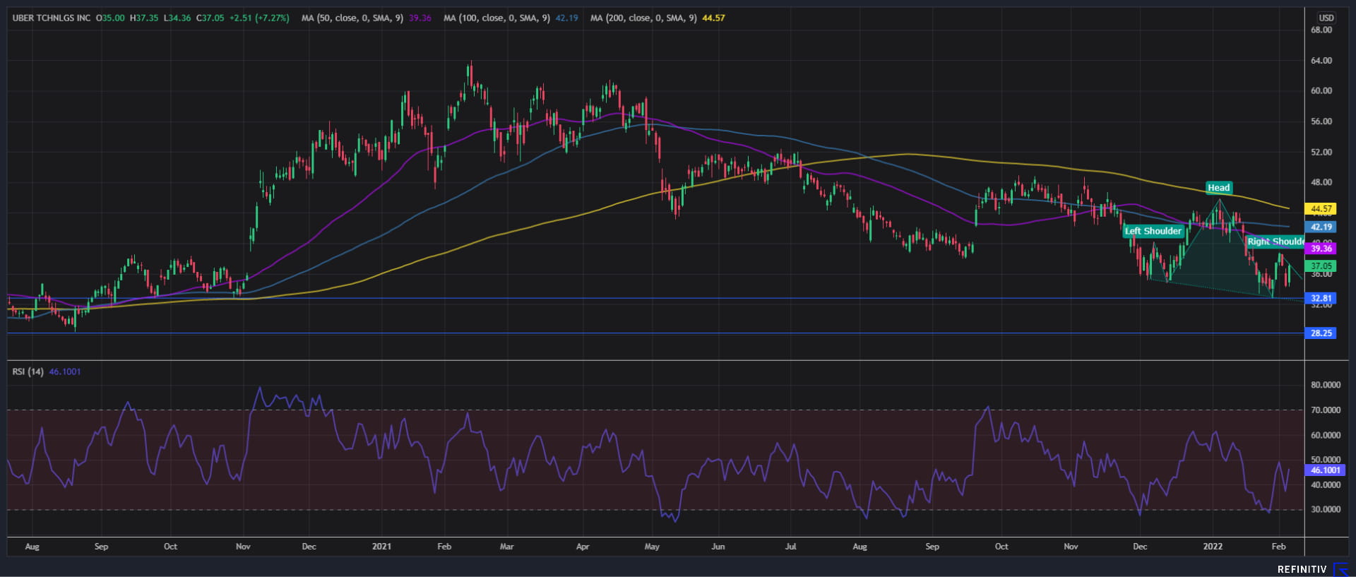 潜在头肩形态在12月开始浮出水面后即将成形。但只有股价下破近期底部32.80美元 (也是2020年9月和10月的关键底部)才能确认形态,28美元随之进入视野。看跌RSI信号及均线状态支持潜在推低,50天均线低于100天均线,100天均线又低于200天均线。