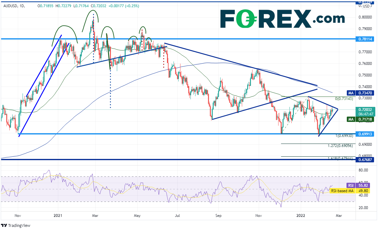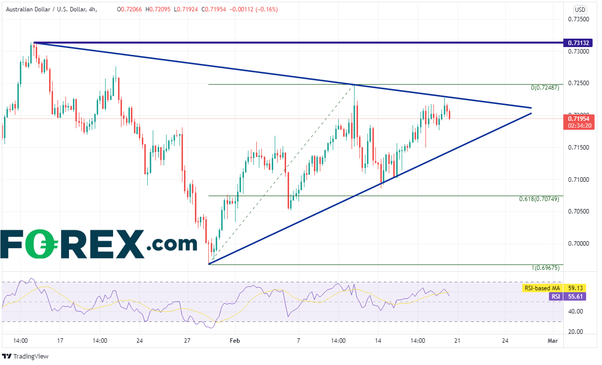 如果美国利率继续上升,那么美元可能随之走高。澳元/美元继2021年2月25日构筑0.8000高点至今已经下跌近一年。该货币对2021年6月-11月期间盘整并形成对称三角形,最终于2021年11月19日在0.7275附近向下突破,后跌至2020年11月3日以来水平支撑位0.6990附近并企稳。澳元/美元在1月31日反击该位,目前挺进另一对称三角形的尖端附近,即0.7200一线。