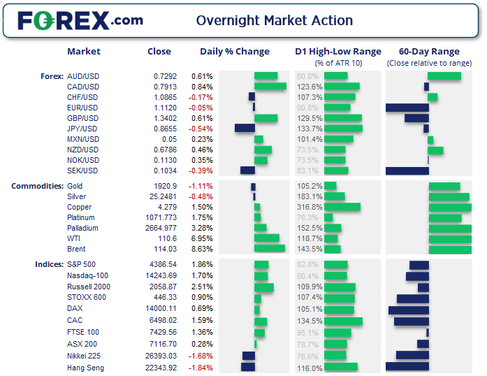 市场曾有猜测认为,俄乌冲突可能促使美联储或暂停加息,及/或下移后续加息的轨迹。但鲍威尔成为美联储具有投票权的成员中最新表态继续支持3月加息的成员,虽然在提到连续加息方面也表示,美联储将“一边执行该计划一边谨慎观察”。华尔街对此做出积极的回应,所有主要股指同步上涨。但美元下跌带动商品货币上涨,只是加元因为加拿大央行加息而独占鳌头。