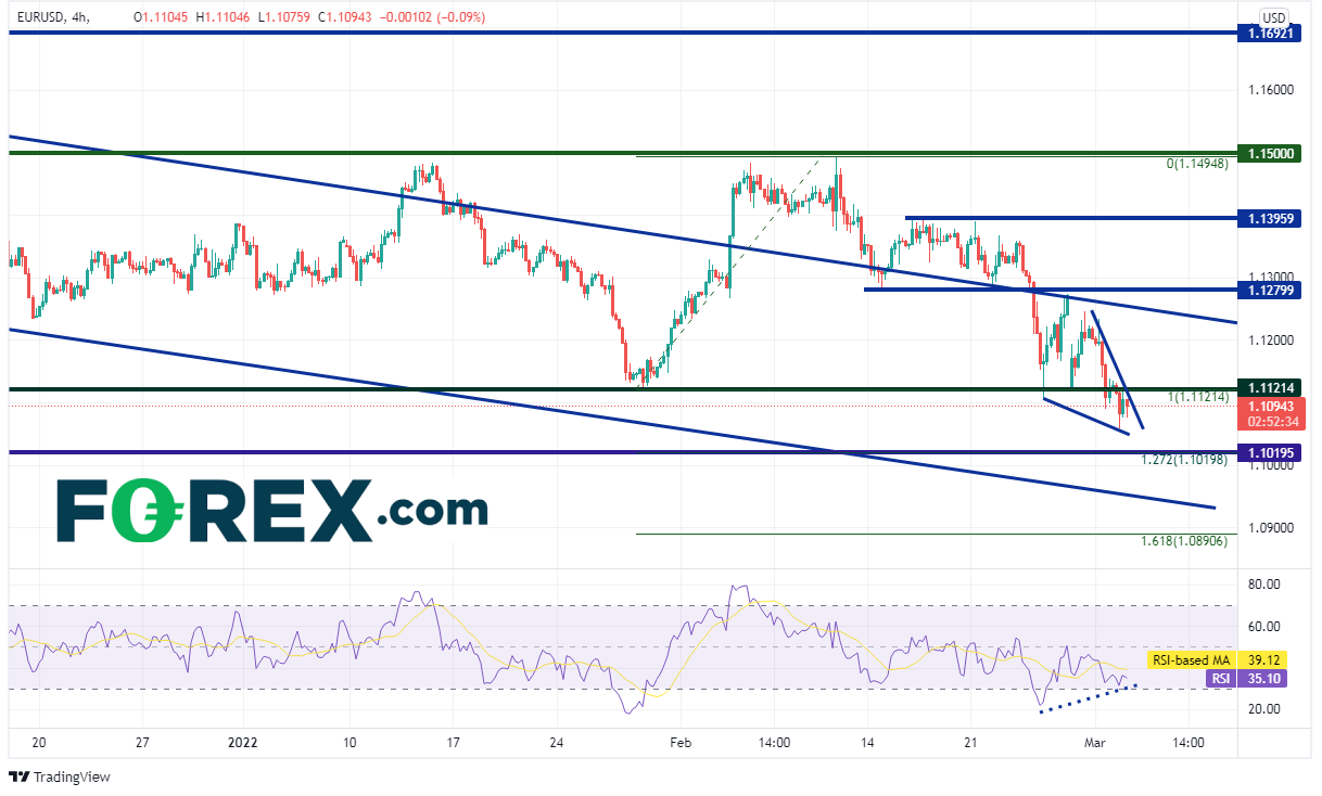 价格在4小时图上断然下破1月28日低点并危及2月10日低点到高点行情的127.2%扩展位兼2020年4月以来的水平支撑位,即1.1050附近。下方的长期通道下轨趋势线所在的1.0950附近构成支撑,接着是前述行情的161.8%扩展位1.0890附近。