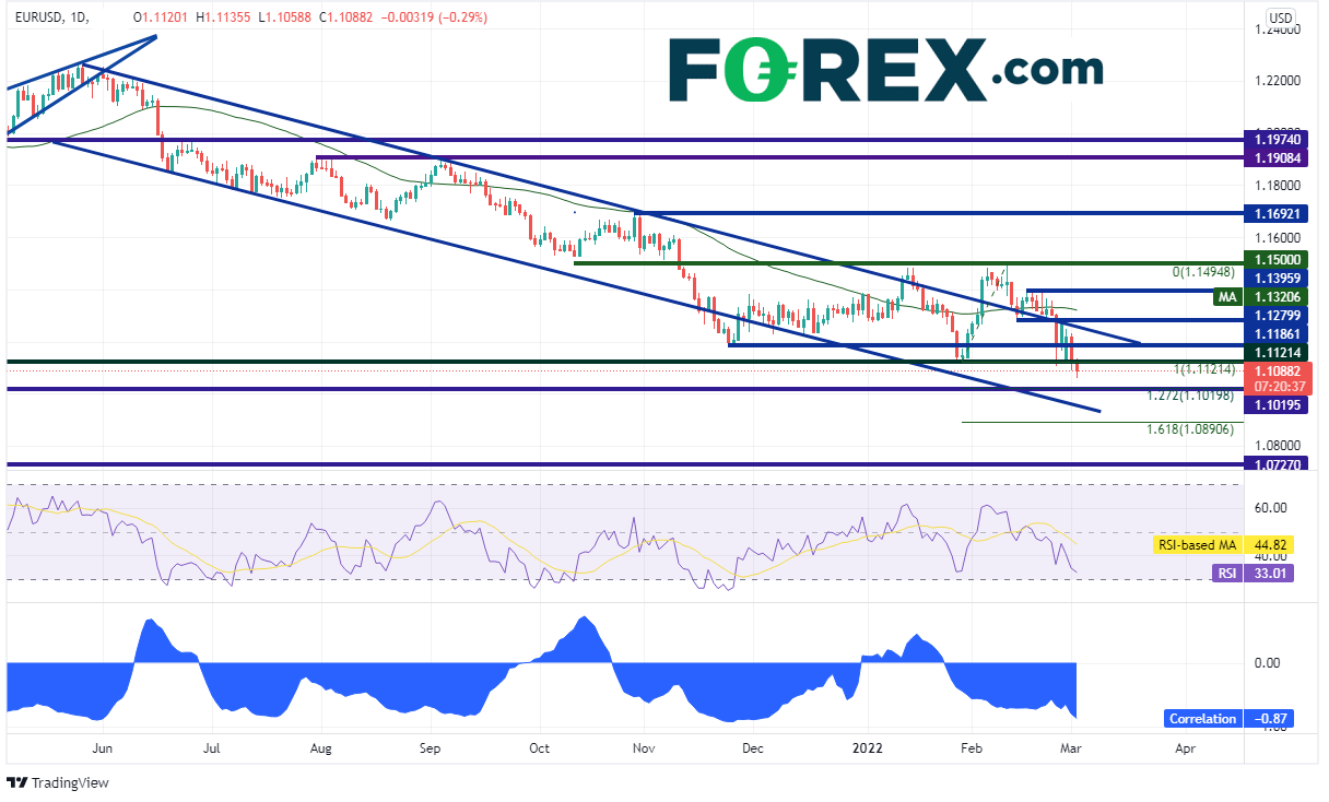 欧元/美元2021年5月以来一直交投于下降通道内,今天触及2020年5月以来最低点1.1059附近。请注意,欧元/美元和美元/俄罗斯卢布之间的相关系数为-0.87。相关系数报在-1.00表明两种交易产品完全负相关,完全反向波动。相关系数低于-0.80表明强负相关。所以,如果美元/俄罗斯卢布继续上涨,则欧元/美元继续下跌可期。