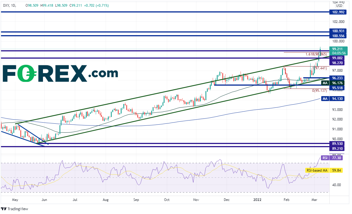 美元指数2021年5月以来有序走高并形成上涨通道,一度在11月底站上通道的上轨趋势线,至96.94,只是后来回落至通道内。价格突破通道一端失败后往往考验通道的另一端,美元指数也确实在回到通道内后于1月考验通道的下轨趋势线94.66附近,此后调头走高,周五收上通道的上轨趋势线和水平阻力位。美元指数今天继续上涨,击穿了更多水平阻力位与1月28日高点到2月4日低点行情的161.8%扩展位98.87附近。要想延续涨势,必须攻克100.00整数心理关口、100.87水平阻力位和2020年3月高点102.99。但请注意,RSI超买表明价格强劲准备回调。