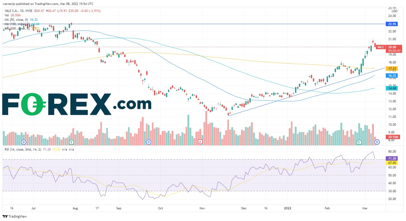 巴西淡水河谷股价自11月中旬以来一直处于上涨趋势中,最近更是因为过去两周大宗商品价格飚升而加速上扬。周一,多头成功推动价格创下7个月高点21。但因为进入了超买区域,催生获利回吐盘。如果延续当前趋势,价格可望收复21并剑指23。即使价格跌至200天均线17,也可能有能力维持当前上涨趋势。但如果跌破17,可能打开下行空间,先后跌至100天均线16和50天均线14.50。