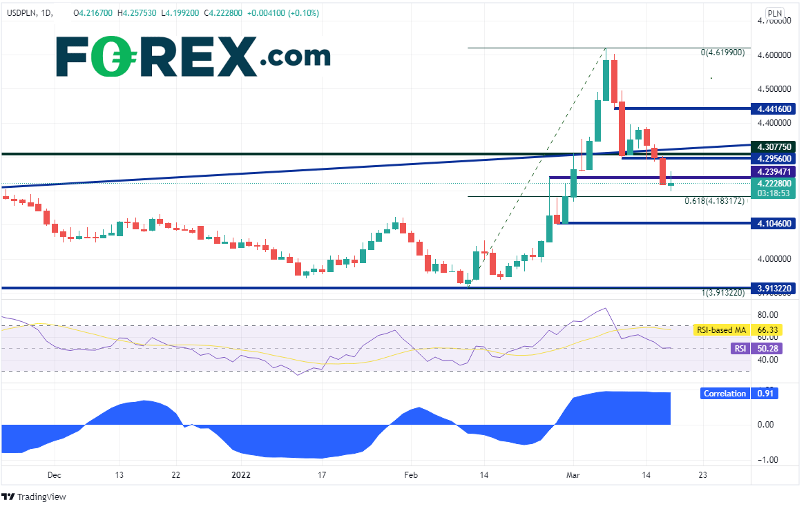 可能有交易者在寻找与西得州原油高度相关的货币对。美元/波兰兹罗提与油价之间的相关系数为+0.91,如果达到+1.00,表明两者在100%的时间里同向波动。所以,+0.91已经属于相当高的关联性。如果相信油价上涨,那么美元/波兰兹罗提也有很大机会上涨。该货币对的强阻力落在4.2956-4.3253区间之上,其由3月9日低点、前高点、长期上升趋势线组成,然后是水平阻力位4.4416。第一支撑位在2月10日低点到3月7日高点行情的61.8%回档位4.1832,然后是水平支撑位4.1046。