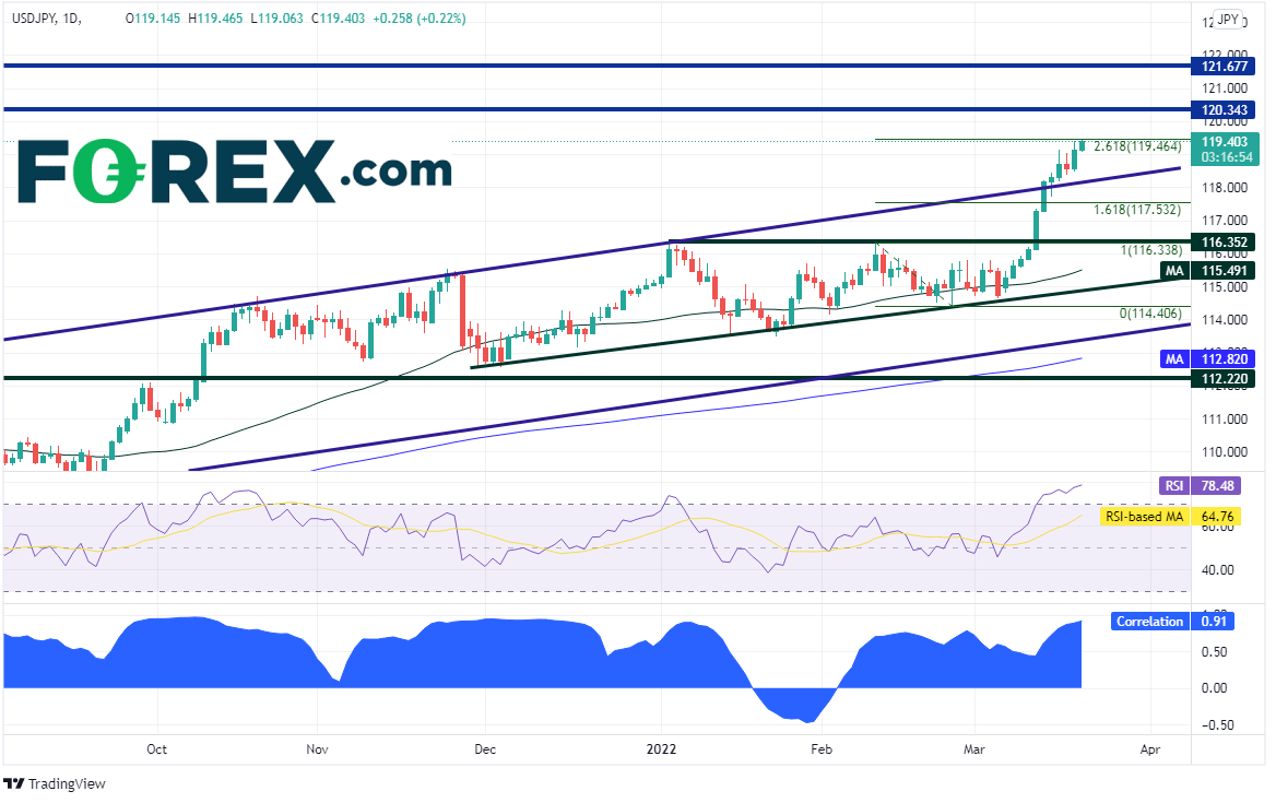 美元/日元也跟随美债收益率上涨。两者的相关性已经恢复,目前的相关系数为+0.91。如果报在+1.00,表示两种交易产品完美正相关,在100%的时间里同向波动;高于+0.80被视为相关性强烈。3月初两者的相关系数还低于+0.80。美元/日元到达2月10日高点到2月24日低点行情的261.8%扩展位,即119.46附近,创下6年最高点。第一阻力在心理整数关口120.00,然后是2016年以来水平阻力位123.34和121.68。第一支撑在2020年底以来通道的上轨趋势线118.17附近,然后是2月10日高点116.34,接着是50天均线115.49。