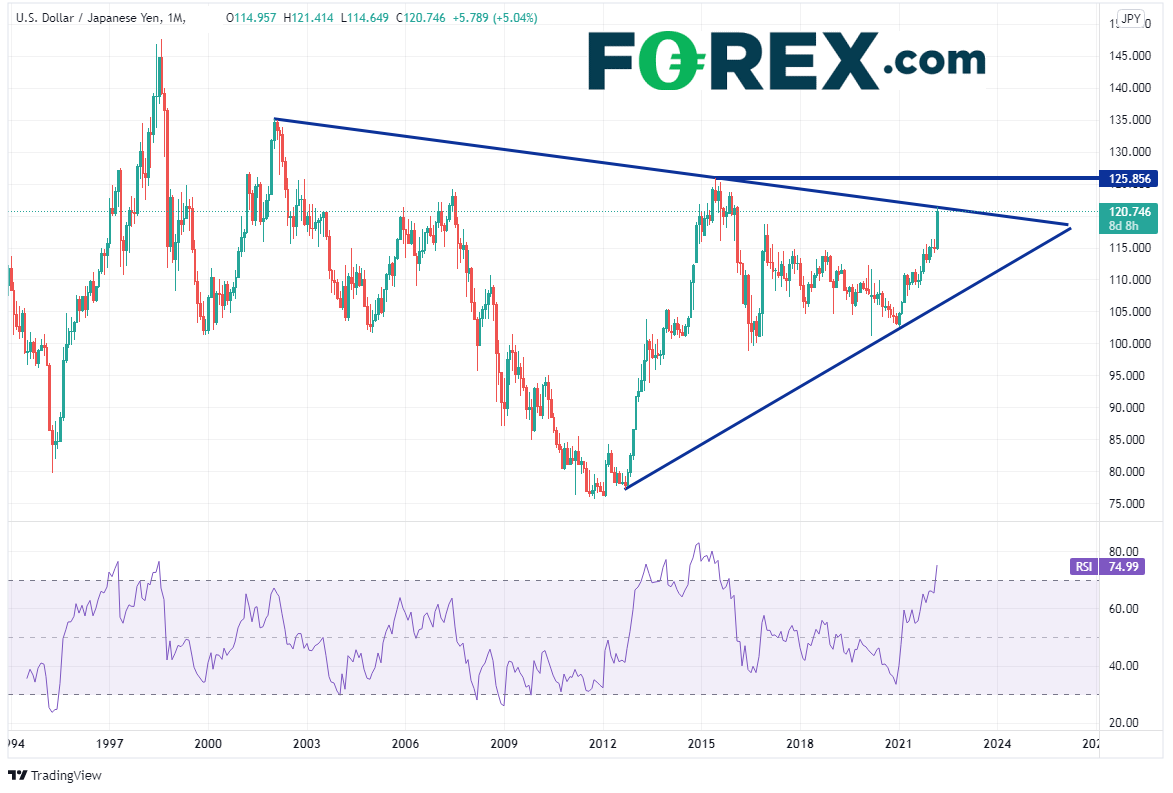 日本央行的货币政策与美联储及英国央行的货币政策相背离,推动美元/日元和英镑/日元近期大涨。但两者在较大时间周期内都遭遇重大阻力位,而美元/日元的RSI超买。两者后市会上涨吗?可能止步于阻力位,但如果月图可以攻克阻力,则有望打开上行空间。