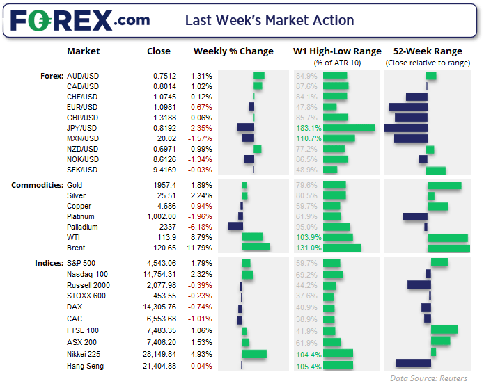 纳斯达克100指数已自本月低点强力反弹,幅度达到13%左右(相比之下标普500指数和道指反弹幅度分别为9.4%和8.3%),确实连续第二个时段收上200天指数移动均线,但周五形成的看跌锤子K线表明多头对马上推高抱持犹豫心态。华尔街上周整体表现明显好于欧洲股市,后者的DAX和STOXX双双陷于横盘区间。中国A50和恒指则调头向下,人们不由得怀疑两者是否已各自触顶。而周末有关上海市将封城的消息,可能在今天进一步打击该地区股市。