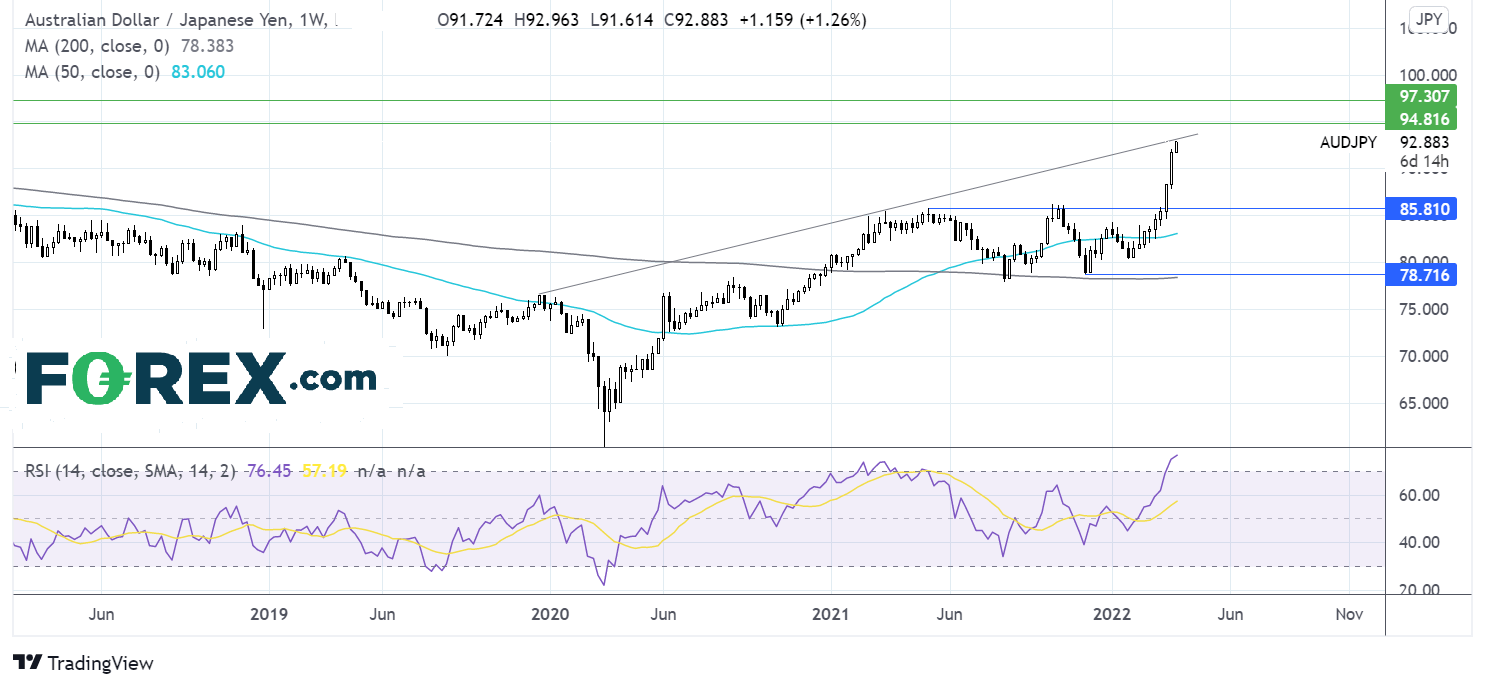 澳元/日元打破去年5月以来的交投区间,站上85.50后大涨,但在2019年年底以来的上升趋势线处遇阻。