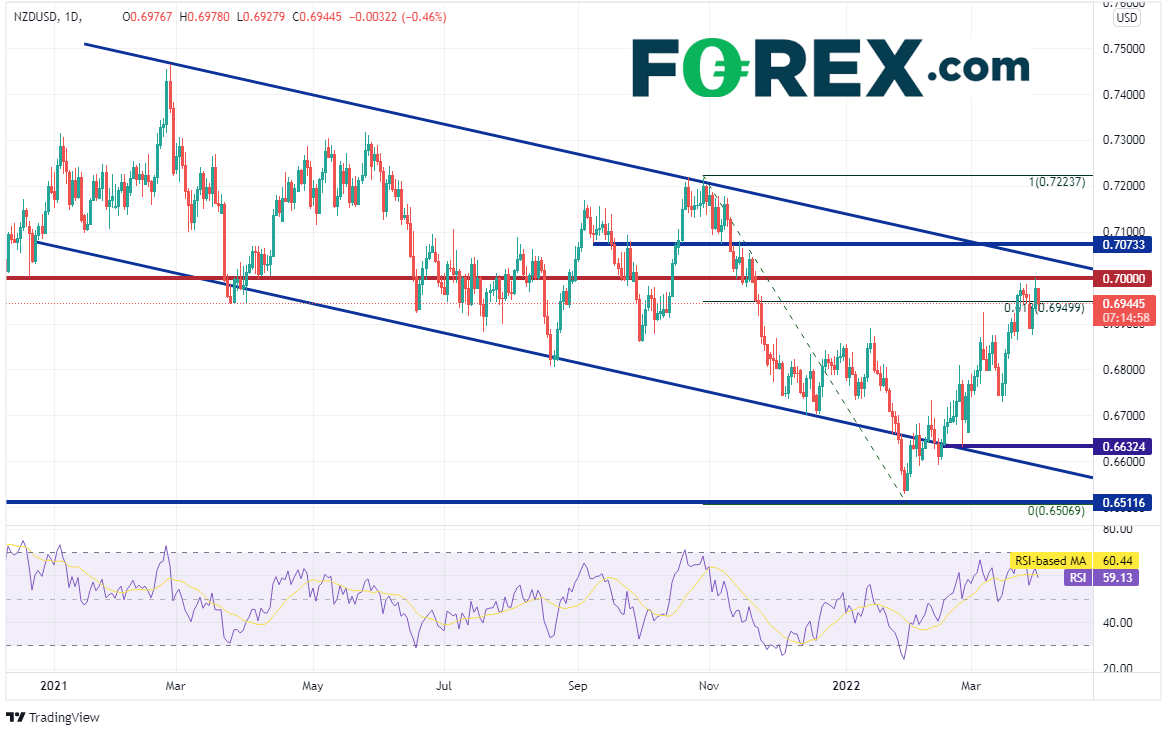 纽元/美元自2021年年初创下0.7465高点以来长期交投于下跌通道内,1月26日假性下破通道下轨,最低跌至0.6507,此后不断走高,目前交投于2021年10月29日高点到1月26日低点行情的61.8%回档位0.6950附近。昨天价格一度摸至0.7000的整数心理阻力关口,今天则回撤。长期通道的上轨趋势线落在0.7045附近之上不远处,构成后市阻力。如果站于其上,可能上看0.7073的水平阻力位,站上后者,则打开上涨空间,目标2021年10月29日高点0.7224。