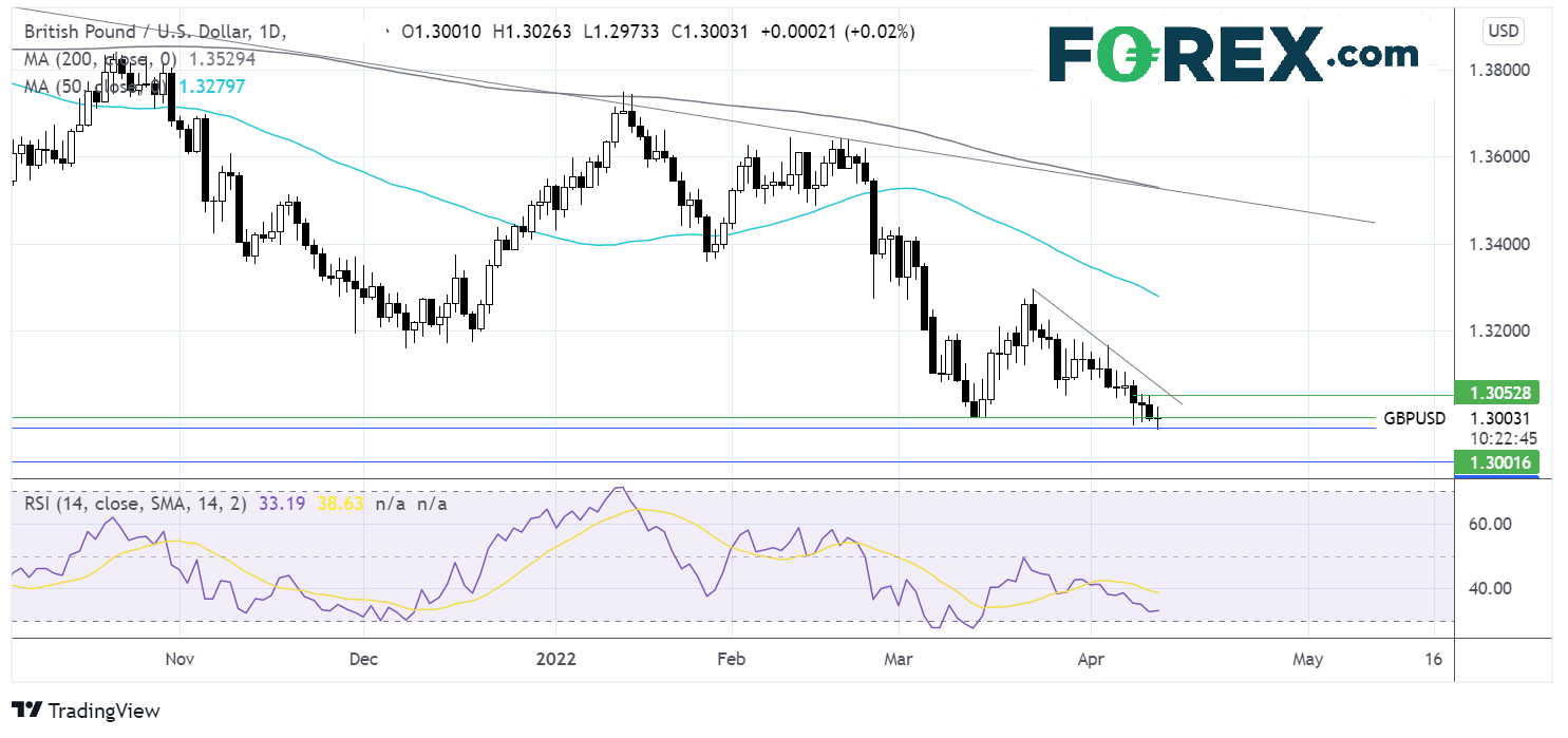 英镑/美元3月23日以来不断下跌,形成系列下降的高点和低点。该货币对业已下破心理大关1.30和2022年低点1.2980,后市或跌至1.29整数关口。