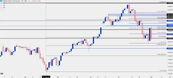 尽管如此,下面的日线图上的形态是很清晰的,自7月11日以来的看跌吞噬K线标志着趋势的顶部。18725点仍是关键,如果空头能推低至该点下方,就有可能重新测试近期看涨趋势的61.8%回撤位,即18591点。在此下方,我正在追踪18435点,其后是一个交汇点,区间为18000点-18026点。