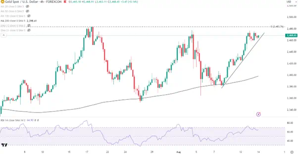 短线来看,图中上升趋势线正在为金价提供支撑。若今晚CPI数据弱于预期,有机会帮助金价冲击并创造新的历史高点。