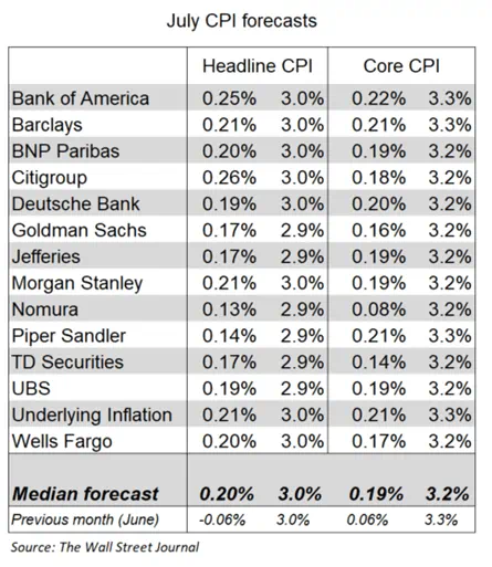 市场普遍预计本次CPI从3%(13个月低点)降至2.9%,从月率来看前值已经跌至疫情以来最低的-0.1%。核心CPI预计从3.3%(3年低点)降至3.2%,下图是华尔街日报汇总的各大金融机构对此次整体和核心CPI的环比/同比的预测。