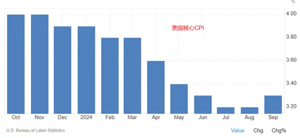 市场普遍预计本次CPI将从2.4%小幅升高至2.6%,核心CPI(下图)或维持在3.3%。若数值高出预期,未来的降息押注可能被进一步缩减(12月维持利率不变的概率升至35%)从而继续利好美元。反之,可能会放缓美元的升势。