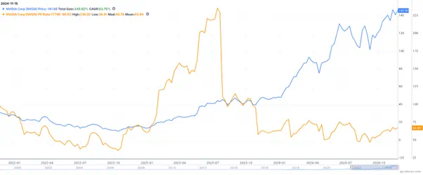 英伟达股价(蓝)和市盈率(黄)(2022-2024) 来源:Gurufocus